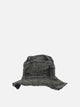Cappello bucket "The Old Man and the Sea" Kapital, realizzato in denim con trama e ordito tinti tono su tono. La costruzione presenta molteplici linee di cucitura e zone di usura distribuite sulla superficie. La silhouette è strutturata e morbida, con tesa continua e calotta tondeggiante. I dettagli visibili includono la texture compatta del tessuto e l'intensità delle cuciture, elementi che contribuiscono alla definizione della forma.