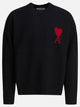 Ami Paris wool "Ami de Coeur" crew-neck sweater made of felted merino wool jersey knit. The uniform weave of the knit gives the garment a compact structure, with a regular silhouette defined by linear seams on the shoulders and sleeves. The crew neck incorporates a ribbed hem, while the inlay work highlights the Ami de Coeur motif positioned on the chest. Elasticized trims at the cuffs and hem complete the construction.