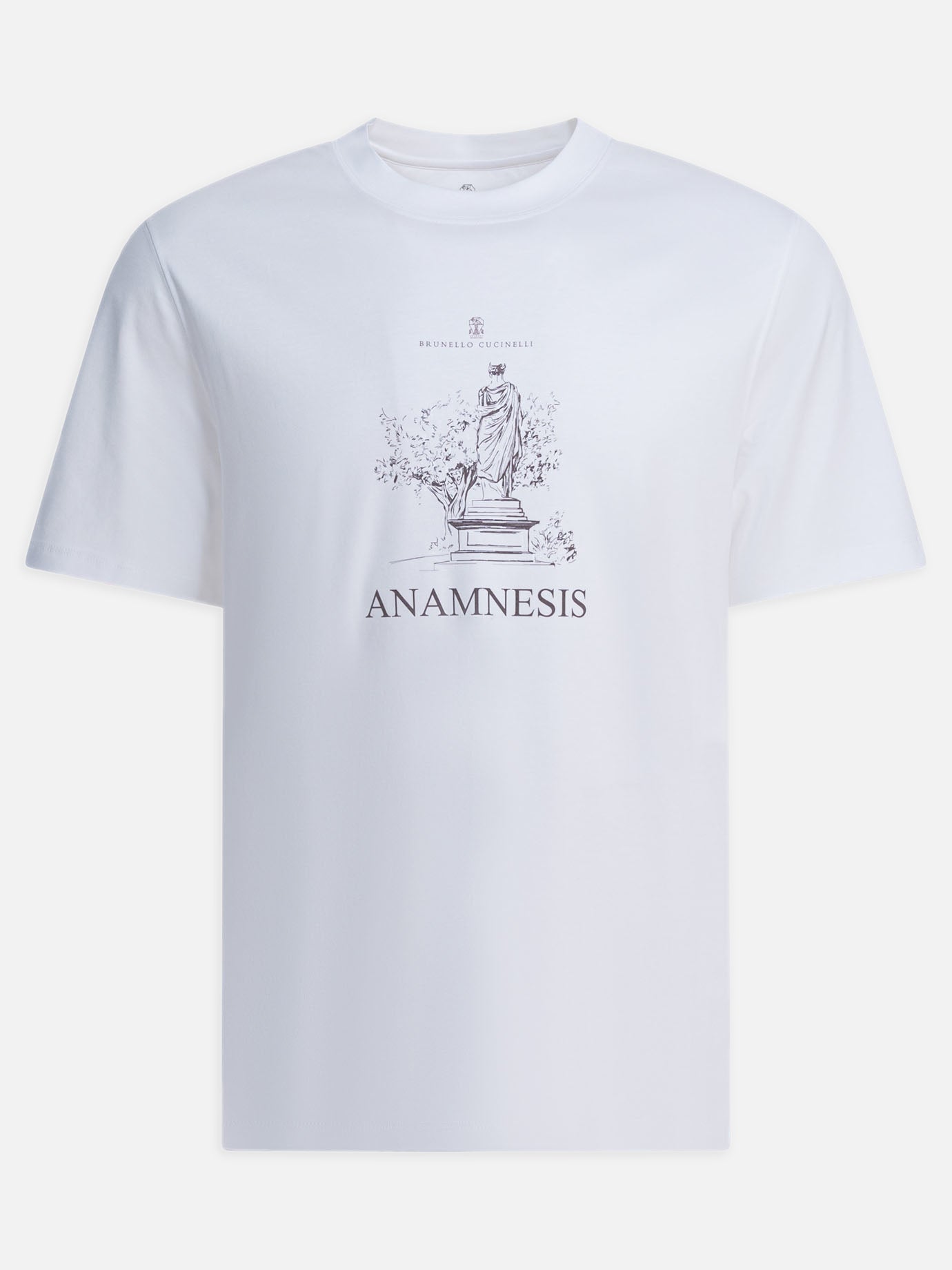 Brunello Cucinelli "Anamnesis" T-shirt with short-sleeved construction and straight-line silhouette. The construction uses compact pure cotton jersey, featuring a smooth surface and a light, flowing hand. The cut features a comfortable fit with precise finishing on the seams. The contrasting "Anamnesis" print is applied on the front enhancing the materiality of the pure cotton fabric.