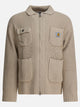 Carhartt WIP lightweight "Chore Knit" jacket with acrylic, wool and nylon blend yarn construction. The silhouette is inspired by work jackets, with straight line, four front patch pockets, one of which is closed by flap and button. Double-slider zipper with logo on zipper puller. Square fabric label applied to the front. Visible stocking at the armholes.