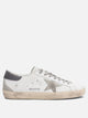 Golden Goose's "Super-Star" sneakers exemplify timeless style, perfect for a modern man's everyday wear. Each pair is a work of art that reinvents tradition with unique new details while always maintaining their iconic essence. These models feature a leather upper that is interwoven with striking design elements, such as the distinctive suede star and petrol blue heel, adding a sophisticated nuance to the ensemble.