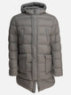 Herno long hooded down jacket with padded construction, made of wool and goose down blend. It features a linear silhouette, extended-length structure and integrated hood. The front closure is concealed by a zipper, while the sleeves are long. The front includes two welt chest pockets and two flap pockets. The hem is straight and the design focuses on functionality and protection from the elements.