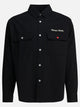 Human Made print overshirt jacket made of thick, durable cotton twill. The construction features a straight construction with a relaxed silhouette. A pocket with a decorative heart-shaped button and chain embroidery above the pocket is attached to the left chest. Reinforced patches are placed on the elbows of both sleeves. A graphic print occupies the back.