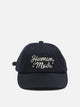 Human Made wool baseball cap made with six-panel construction. The construction uses flannel composed of a blend of wool and nylon that gives the product a compact and durable surface. The silhouette features a clean curved profile. The brand logo is applied to the front via embroidery. Size adjustment is via a back closure with leather strap and embossed "Dry Alls" detail.
