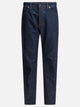Stone Island "Denim-Raw" jeans, made of 13.5 oz indigo-dyed cotton denim with 4-thread twill weave, featuring a five-pocket construction. The back pockets are reinforced and lined with horizontal topstitching, while the front pockets feature a curved construction and a fifth right breast pocket. Front button flap closure, upper visible in black, badge applied on back waist.