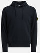 Stone Island organic cotton hoodie with gauzed interior, constructed with exposed overlock seams. The construction features a drawstring-adjustable hood, a pouch pocket with slanted side vents, and a bezel with inner lining located under the back neckline. Cuffs and bottom band are finished with elasticated ribbed edges. The model features a regular silhouette and is garment dyed.