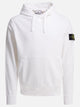 Stone Island organic cotton hoodie with gauzed interior, constructed with exposed overlock seams. The construction features a drawstring-adjustable hood, a pouch pocket with slanted side vents, and a bezel with inner lining located under the back neckline. Cuffs and bottom band are finished with elasticated ribbed edges. The model features a regular silhouette and is garment dyed.