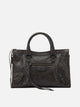 Balenciaga "Le City Bag" handbag in Arena Storico lambskin leather, crafted with two hand-woven handles and soft structure. The silhouette maintains defined profiles, with functional details such as a removable and adjustable shoulder strap and top zipper closure with knotted leather puller. It features a front zipper pocket with zipper puller, interior compartment with cotton canvas lining and additional interior zipper pocket.