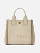 Chloé "Carry" tote shoulder bag made of striped jacquard canvas composed of 91 percent cotton, 6 percent polyester, 3 percent other fibers. The structure is defined by a rigid body with an adjustable silhouette via side magnets that allow for a compact, rounded configuration. Vertical bands of calfskin leather and oversize logo characterize the exterior trim. Double handles and adjustable shoulder strap allow for shoulder or hand carry.