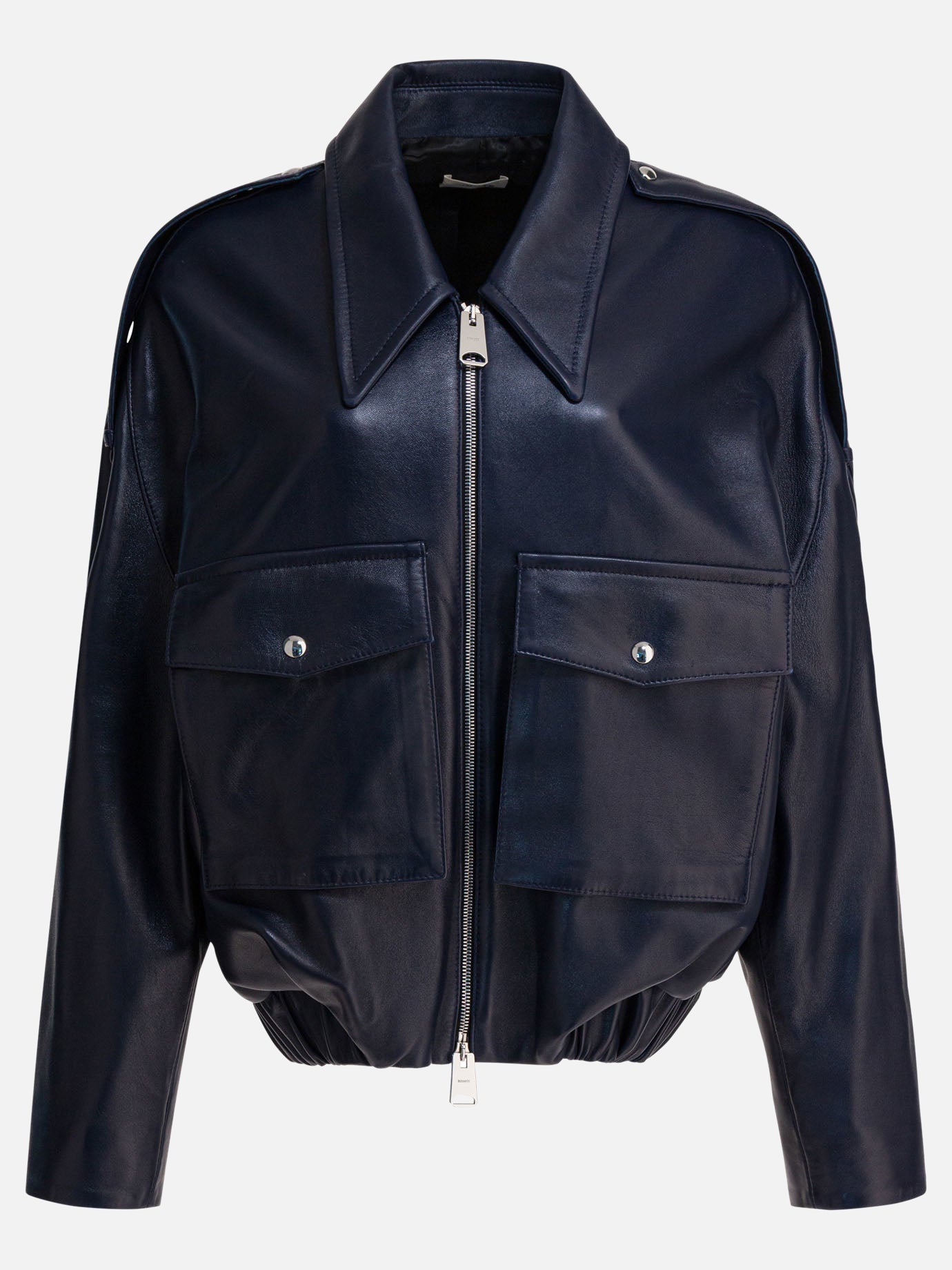 Khaite "Owey" bomber jacket made of soft, lightweight plongé leather. The construction features a rounded blouson silhouette with dropped shoulders and a gathered band hem. The collar, shoulder straps and sleeves are elongated in proportion to the body. Double-slider zipper with distinctive metal details. Two patch pockets on the front. Internally, the jacket is lined in cupro twill with a silky hand.