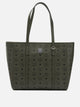 Mcm "Toni" tote bag, constructed of Visetos canvas with semi-rigid structure and defined profiles. The top handles are made of leather and secured with visible stitching. The wide silhouette is complemented by a top zipper closure and interior functional details. Silver cobalt metal hardware and a brass logo plaque characterize the finish.
