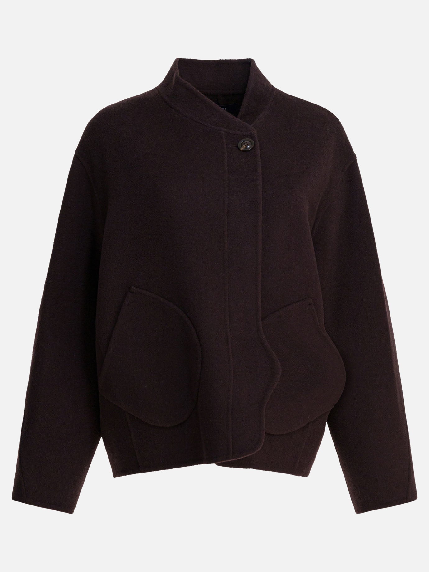 Soeur "Windsor" short coat, made of thick double-sided wool with a wide structure. The model features a short, boxy silhouette, asymmetrical collar and partial concealed button front closure. Two patch pockets on the front define the functional construction. Long, round sleeves complete the essential, structured silhouette. Material selection ensures a firm hand and stable volume.